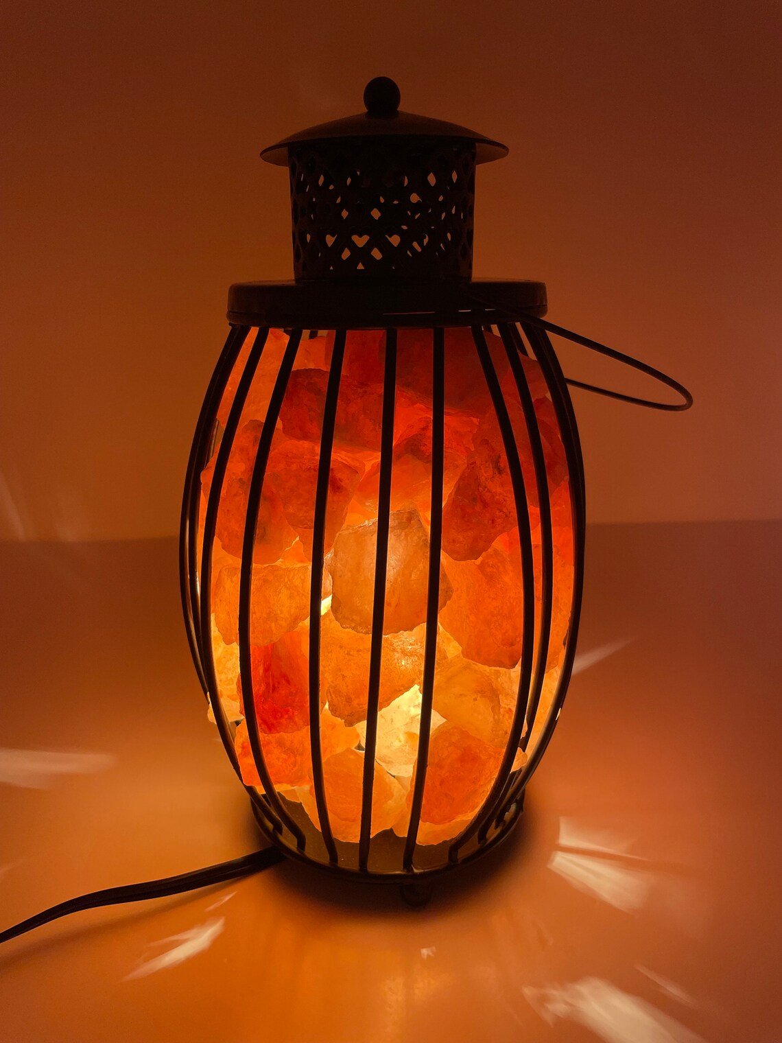 Himalayan Pink Salt Lamp in an iron metal basket with salt chunks, covering shapes, uses, and the manufacturing process: