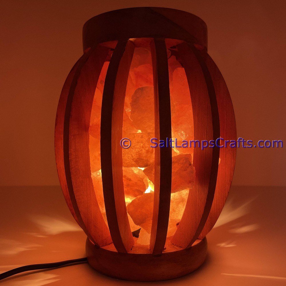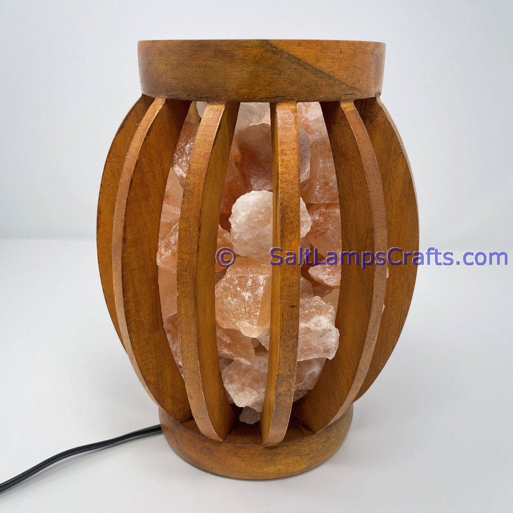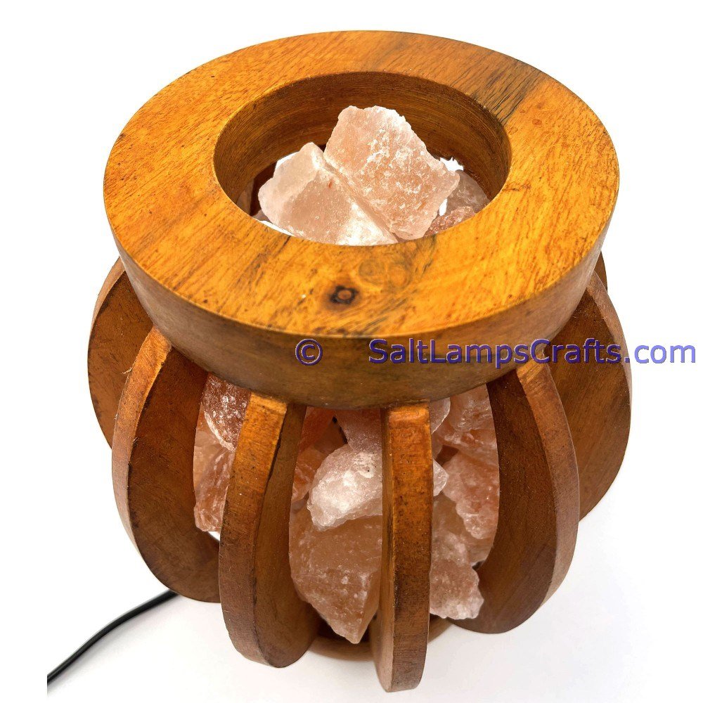• The lamp is securely placed within a wooden basket, providing stability and an extra layer of protection. The wooden basket complements the salt chunks, adding a rustic and earthy element to the overall design.